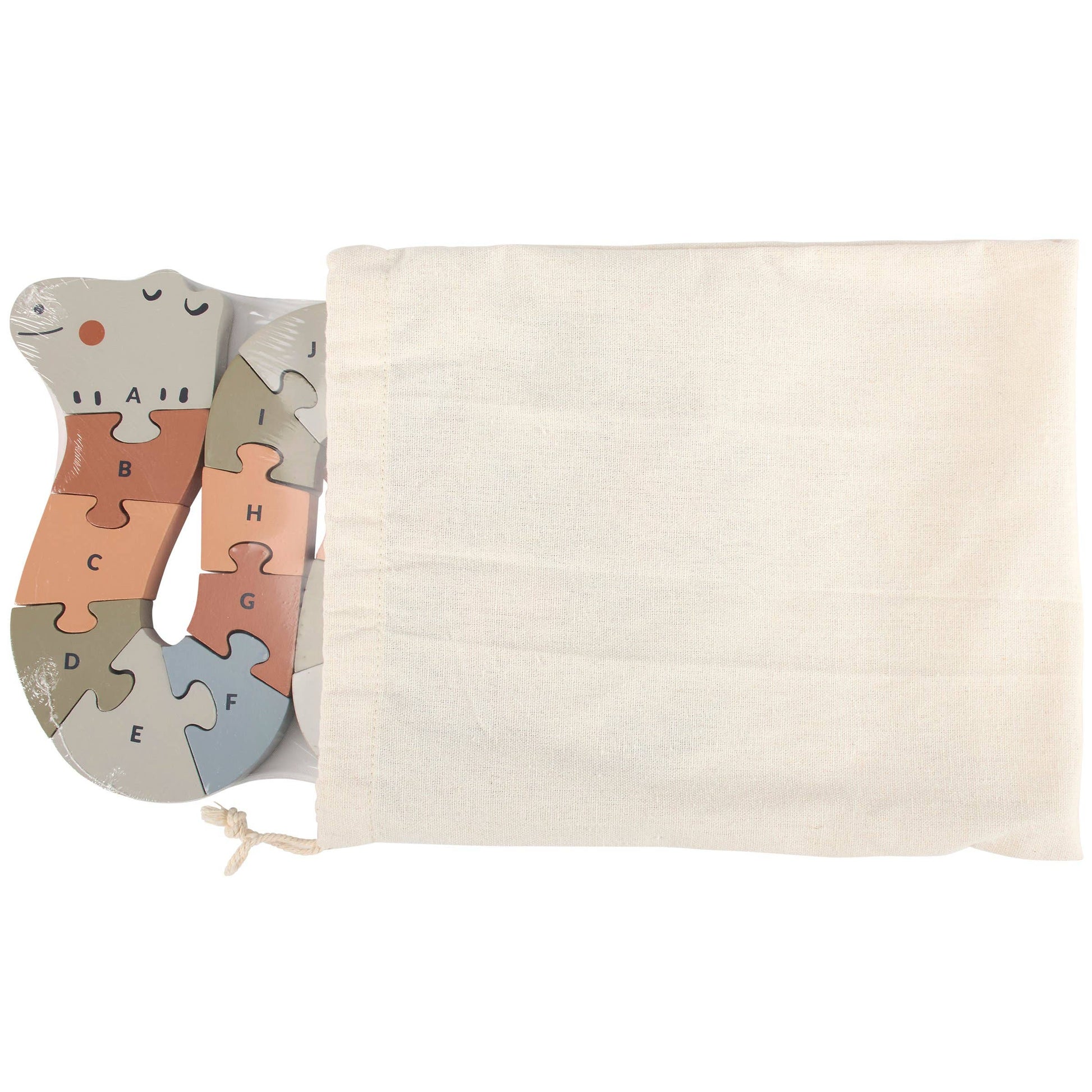 A fun wooden puzzle set from our Baby & Kids Collection displaying a cute pet inspired design replicated from original block print style art. Kids puzzle includes 26 wooden puzzle pieces displaying each letter of the alphabet on unique shapes that easily connect to create a fun snake design. Our Alphabet Snake chunky puzzle is perfect for play with children 24 months or older and looks nice on the shelf as children's room décor when not in use. A fun pet-themed gift for kids birthdays or everyday moments.
