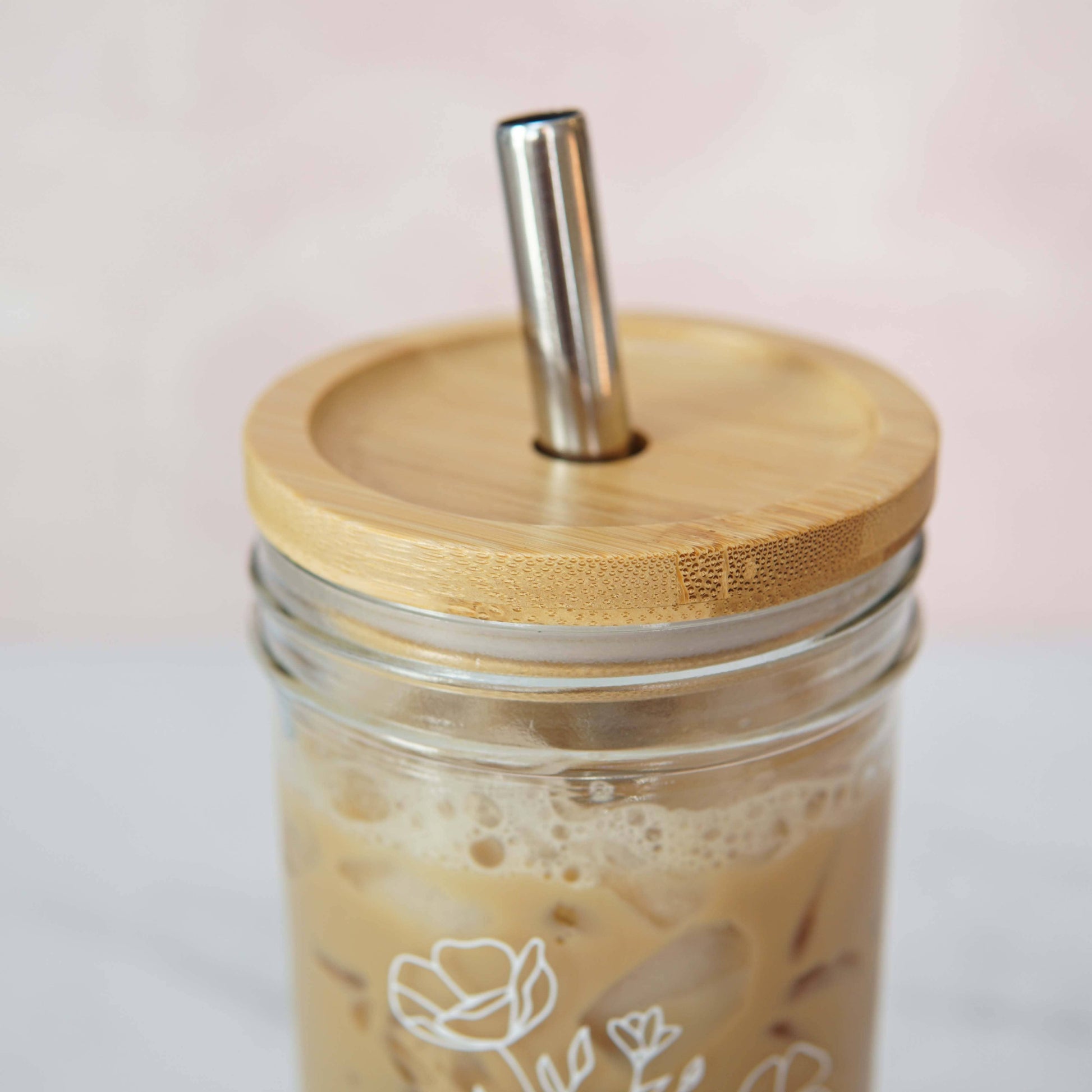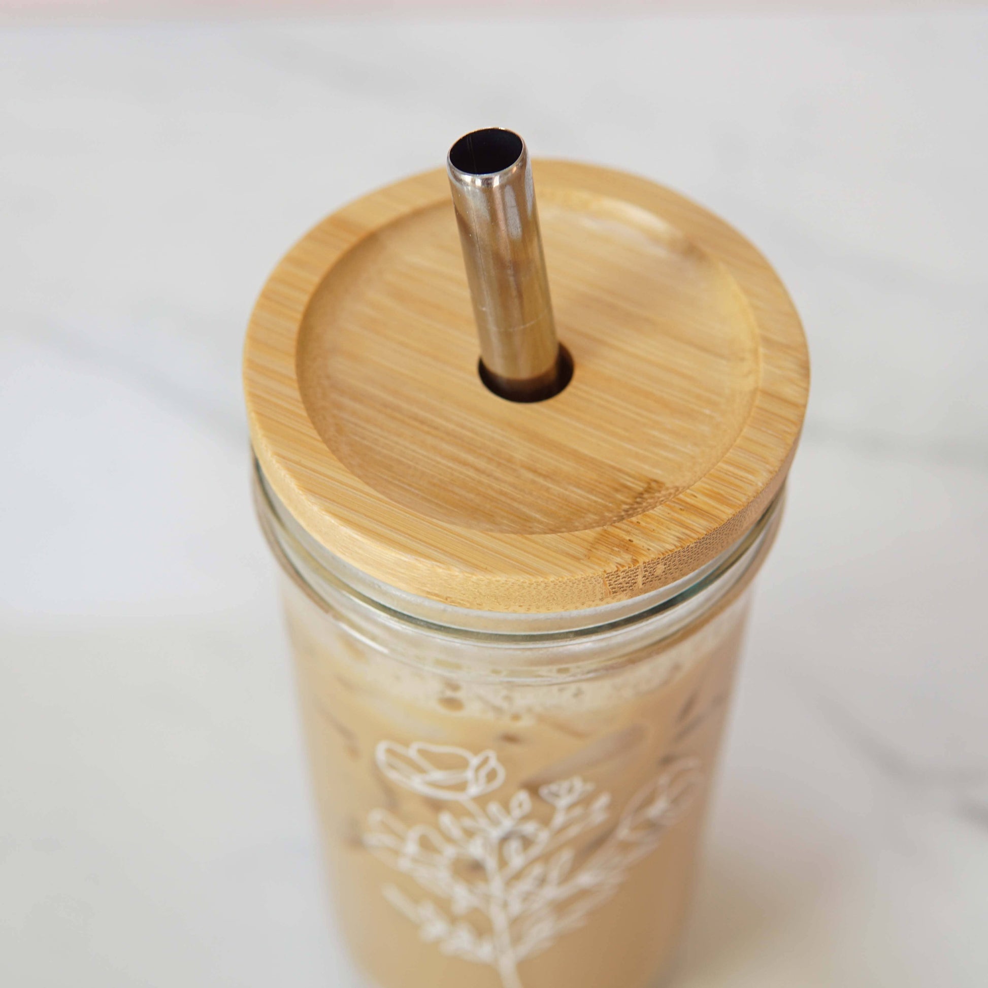 22 oz floral floral mason style straight glass includes 86mm bamboo top & stainless steel boba style straw.